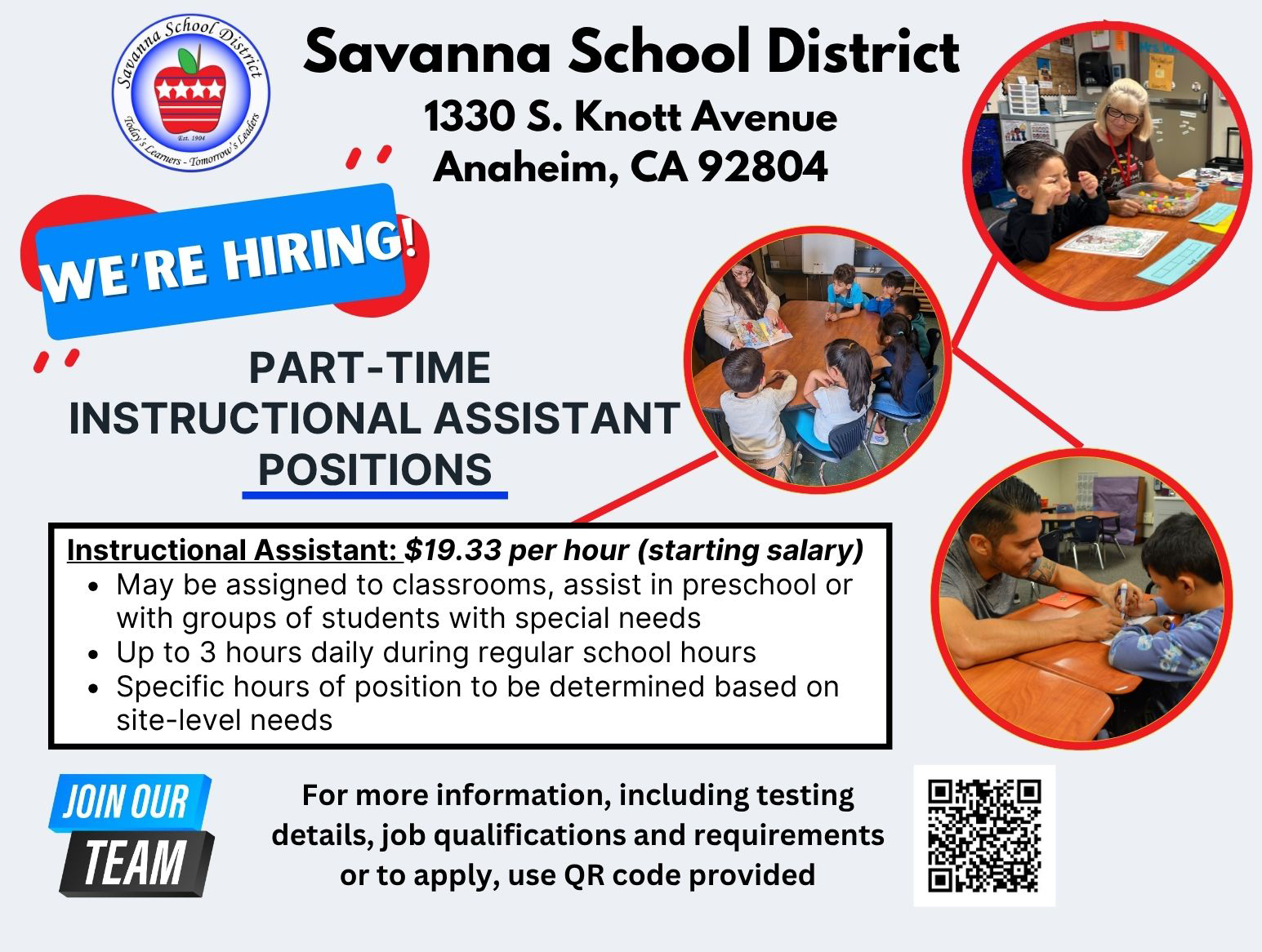 Job opportunities within the Savanna School District are posted on EdJoin.org, shared through our social media channels, and communicated to families via ParentSquare. If you’re interested in joining our team, we invite you to explore current openings and apply for positions that match your qualifications. Visit our social media pages or click one of the the links below for application information.