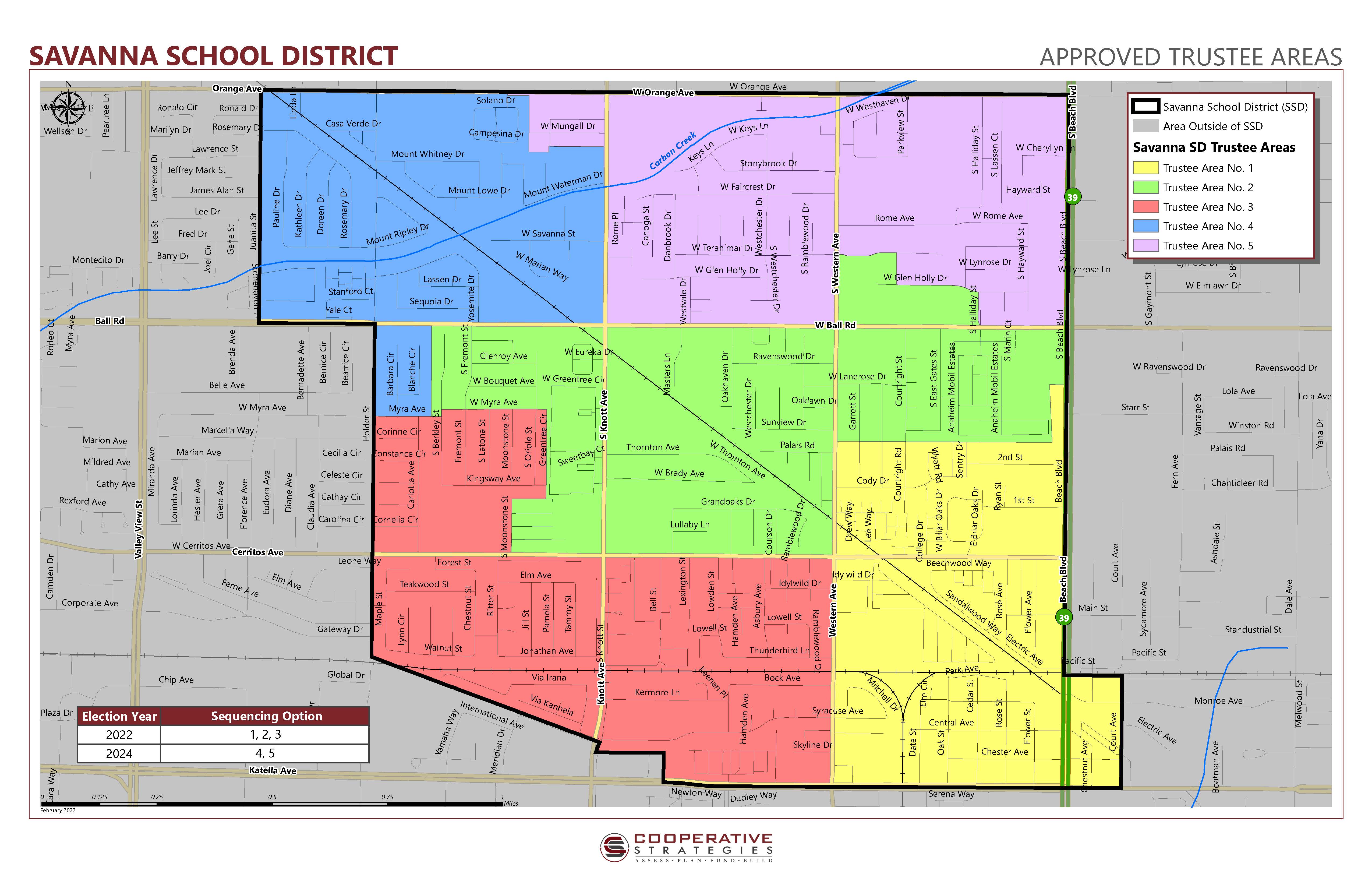 Savanna School District transitioned from at-large elections to by-trustee area elections. Residents are able to vote for a single Board of Trustee candidate residing in their newly drawn trustee area. Under the "at-large" system utilized in elections prior to 2022, all registered voters within the District's boundaries could vote for any candidate for all Board member seats. Beginning with the November 2022 election, candidates will be elected by “trustee areas.” This means only voters within a given trustee area can vote for candidates who reside within that same area. The intent of this proposed system is to offer greater opportunities for Board representation by candidates who might not otherwise be elected under an at-large system. The map below demonstrates the "trustee areas" for the Savanna School District.